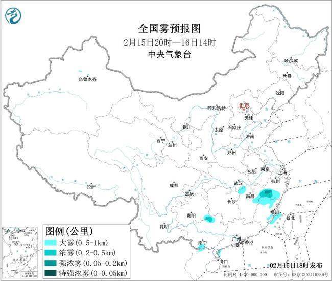 r预计,2月15日夜间至16日上午,福建沿岸海域、台湾海峡西部海域、广东西部沿岸海域、琼州海峡东部海域、雷州半岛东部附近海域、北部湾北部海域将有能见度不足1公里的大雾。此外,2月15日夜间至16日早晨,浙江南部、福建北部、江西东北部等地有能见度不足1公里的大雾,局地有能见度不足200米的强浓雾。