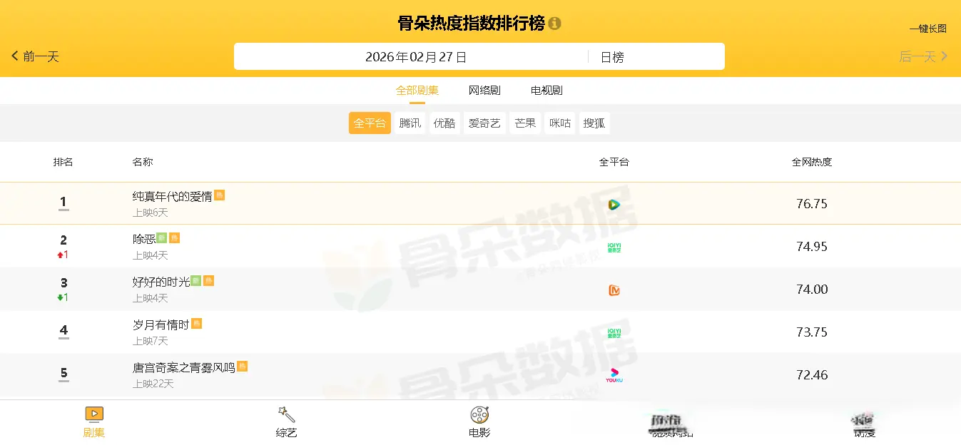 截止发文时间,从“骨朵热度指数排行榜”数据显示可知,当前热播电视剧中,全网热度最高的五部剧分别如下: