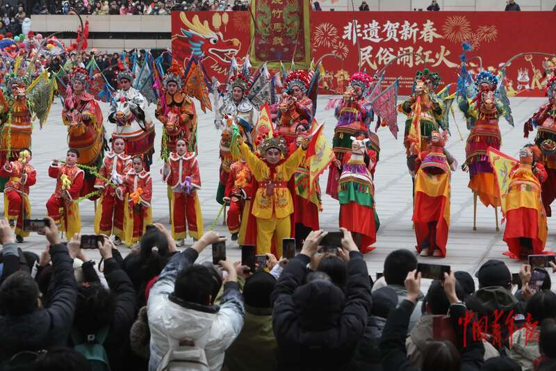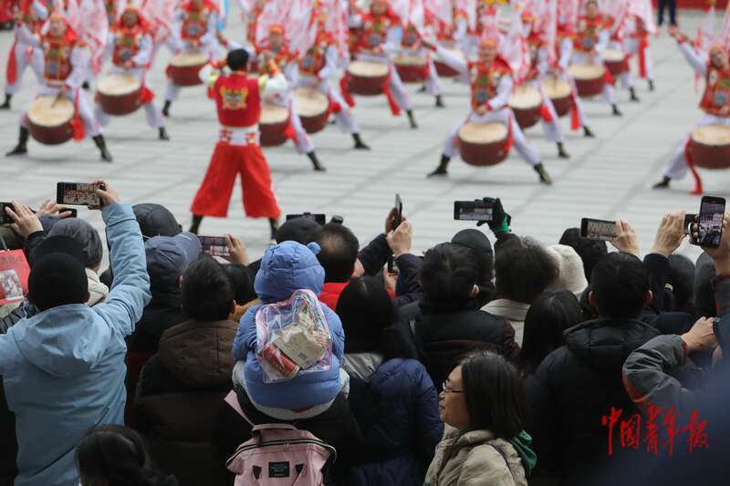 2月28日下午,中国工艺美术馆(中国非物质文化遗产馆)外,观看非遗民俗展演的观众们纷纷拿起手机记录。中青报·中青网记者 孔斯琪/摄