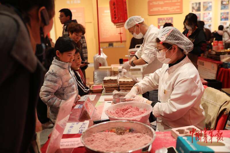 2月28日上午,中国工艺美术馆(中国非物质文化遗产馆),两名小朋友等待购买现场制作的定胜糕。中青报·中青网记者 孔斯琪/摄