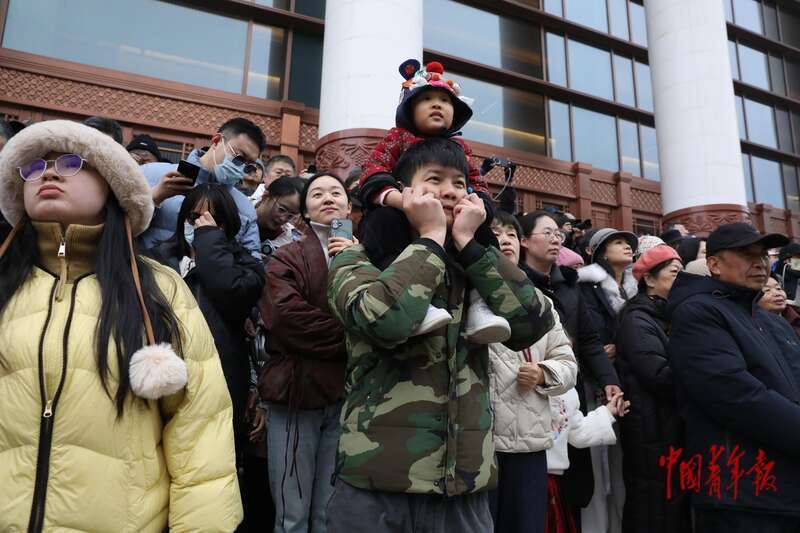2月28日上午,中国工艺美术馆(中国非物质文化遗产馆)外,观众们在观看民俗展演。中青报·中青网记者 孔斯琪/摄