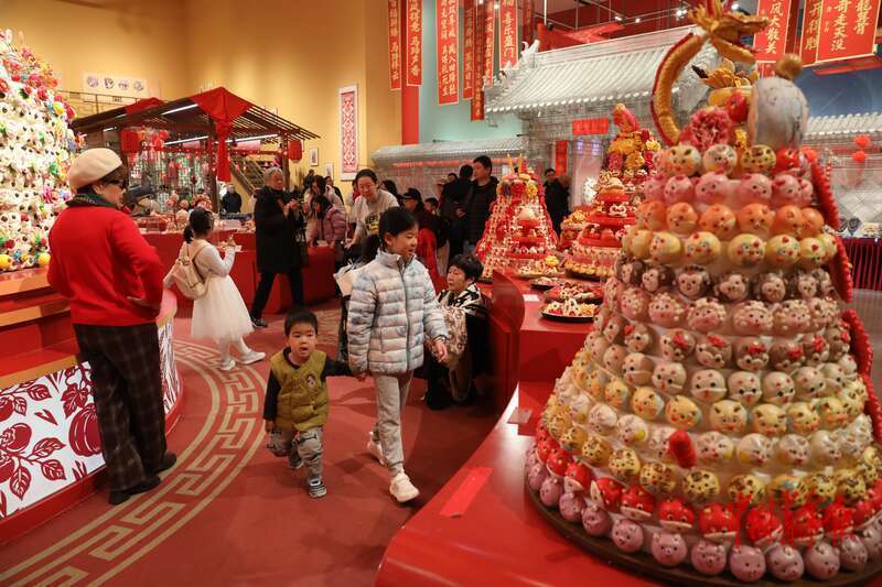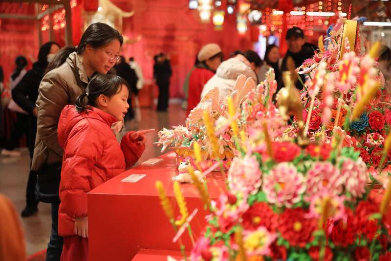 2月28日上午,中国工艺美术馆(中国非物质文化遗产馆),两名小观众在“过年——丙午春节系列主题展”上观看琳琅满目的面花展品。该展览从春节承载的中华民族传统历法、生肖文化、粮食观和灯彩民俗等主题入手,串联起与春节相关的、来自全国各地的百余项非物质文化遗产代表性项目。元宵佳节将近,不少市民游客来到节日氛围浓郁的博物馆和美术馆,赏精美展品、看民俗表演、逛非遗市集、尝各地美食。中青报·中青网记者 孔斯琪/摄