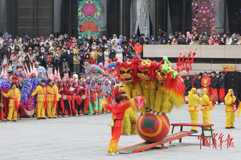 2月28日下午,中国工艺美术馆(中国非物质文化遗产馆)外,北京舞狮表演吸引许多市民游客驻足观看。中青报·中青网记者 孔斯琪/摄