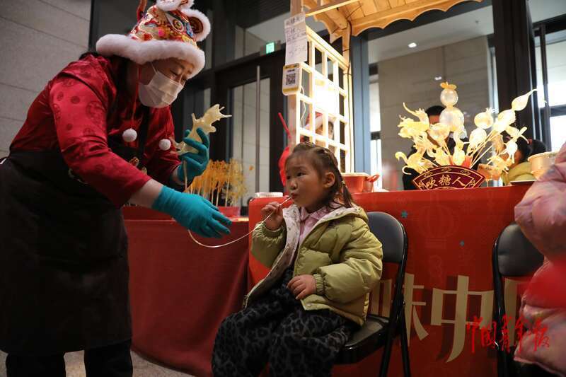 2月28日上午,中国工艺美术馆(中国非物质文化遗产馆),一名小朋友正在体验吹糖人。中青报·中青网记者 孔斯琪/摄