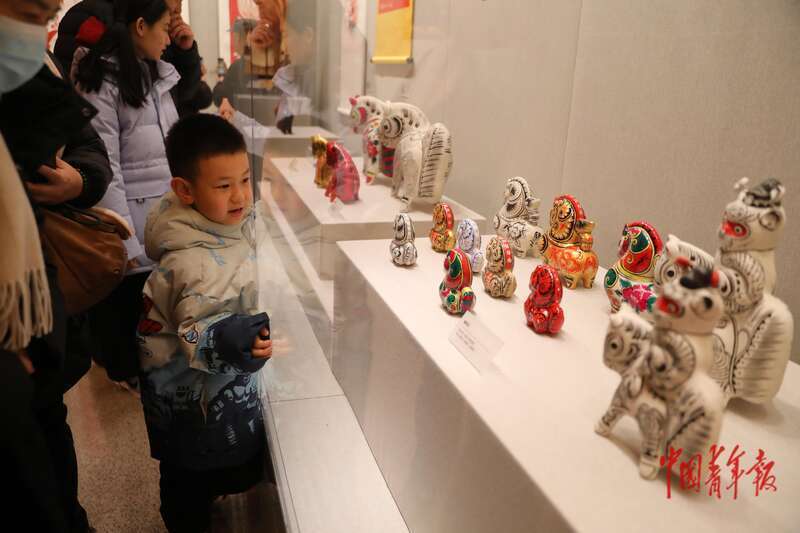 2月28日上午,中国工艺美术馆(中国非物质文化遗产馆),一名小朋友在认真观看小马形状的各色工艺作品。中青报·中青网记者 孔斯琪/摄